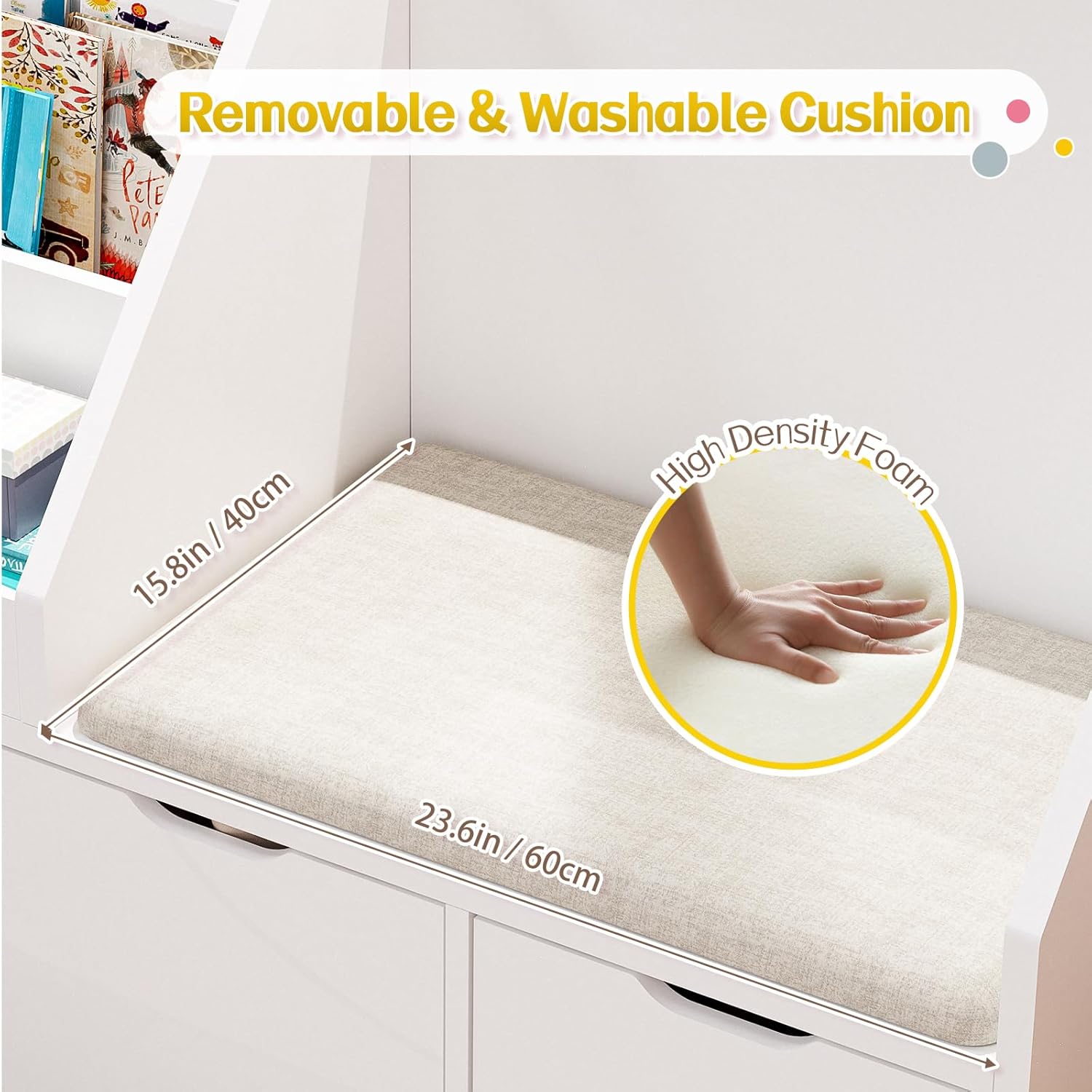 40″ Kids Reading Nook with Bench, Toy Storage Organizer and Bookshelf with Seat Cushion, Kids Bookshelf with 3 Movable Drawers, Toy Storage Box on Wheels, Ideal for Nursery, Playroom, Bedroom, White