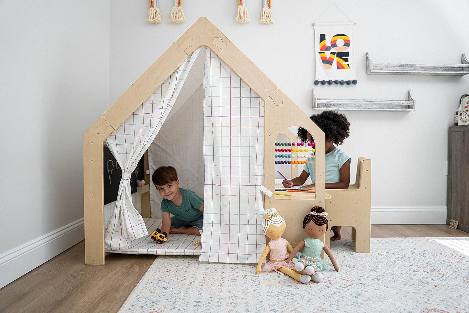Avenlur Flair – 5 in 1 Indoor Playhouse with Desk Table, Chair, Chalkboard, Floor Cushion and Curtain Shades – Montessori and Waldorf Style for Ages 1 to 8 Years Old – (Large, Colorful Balloons)