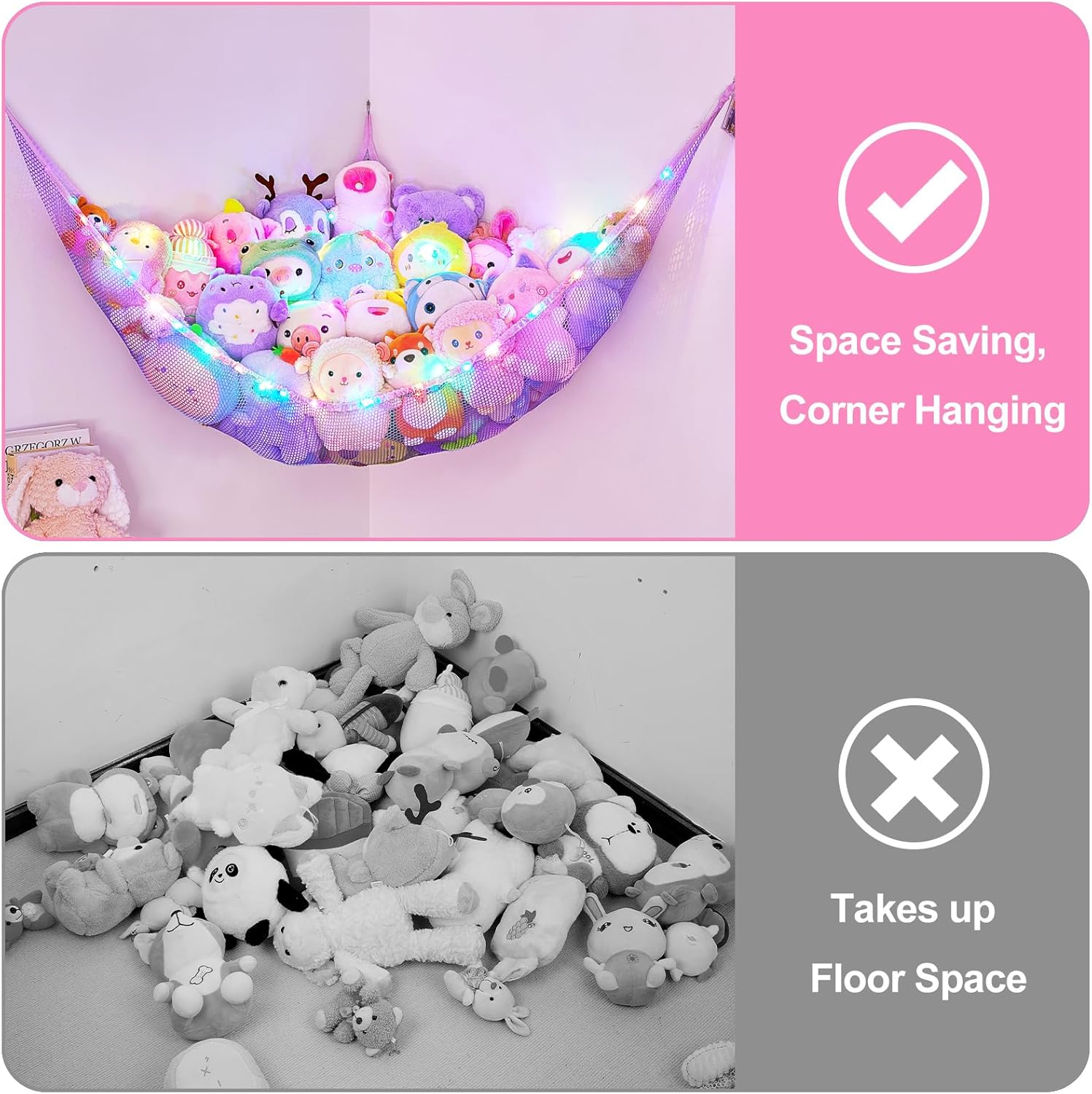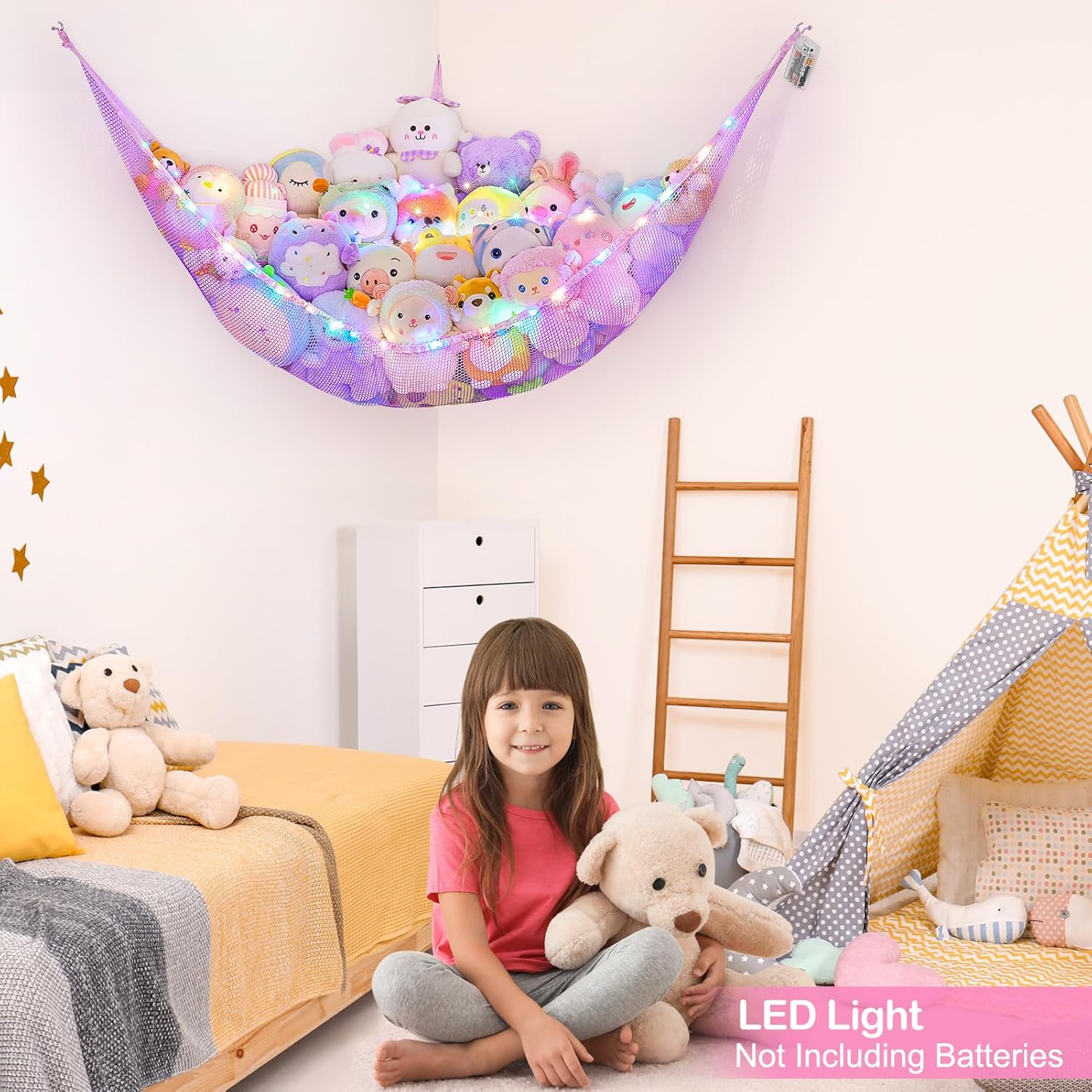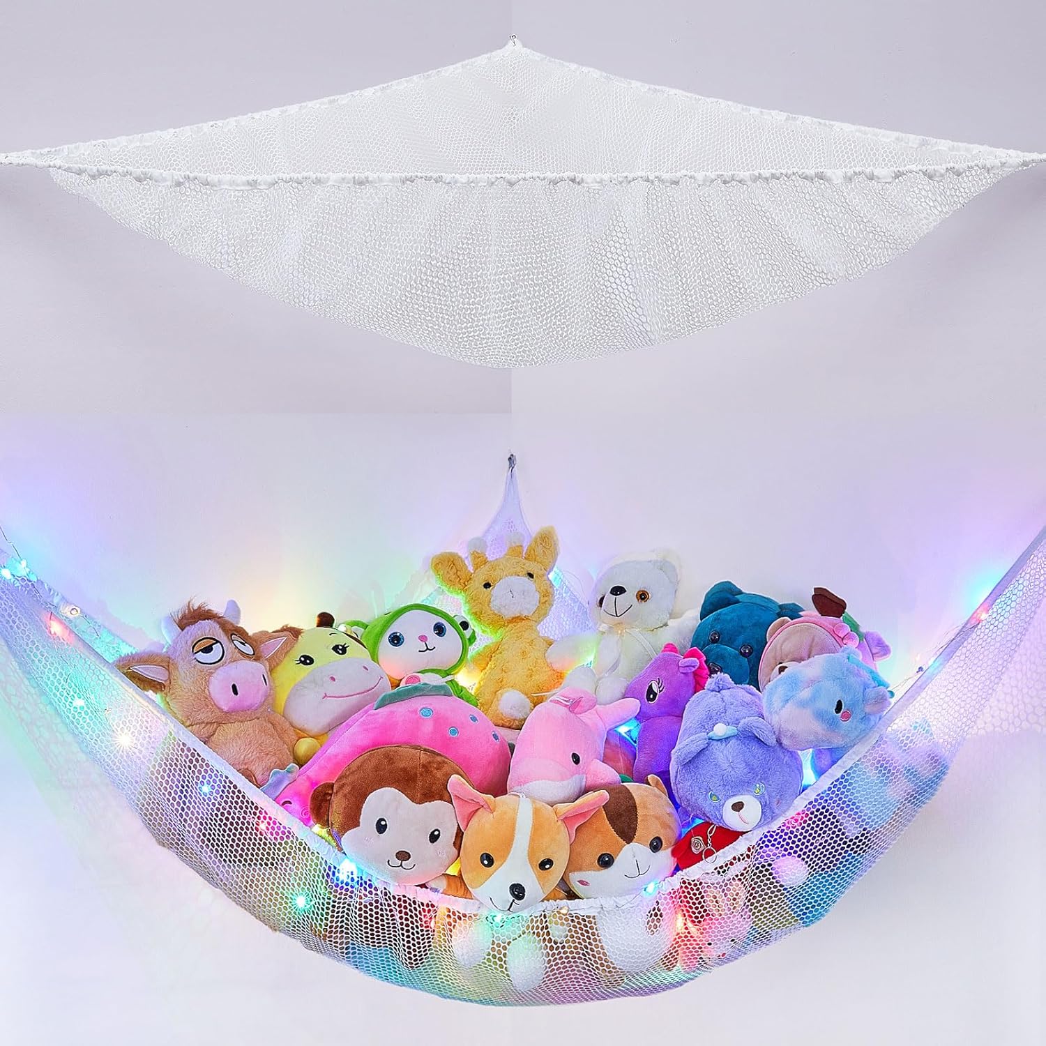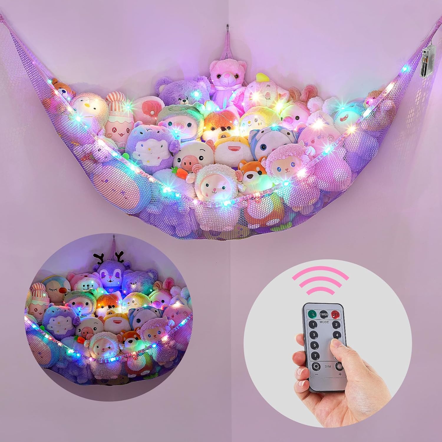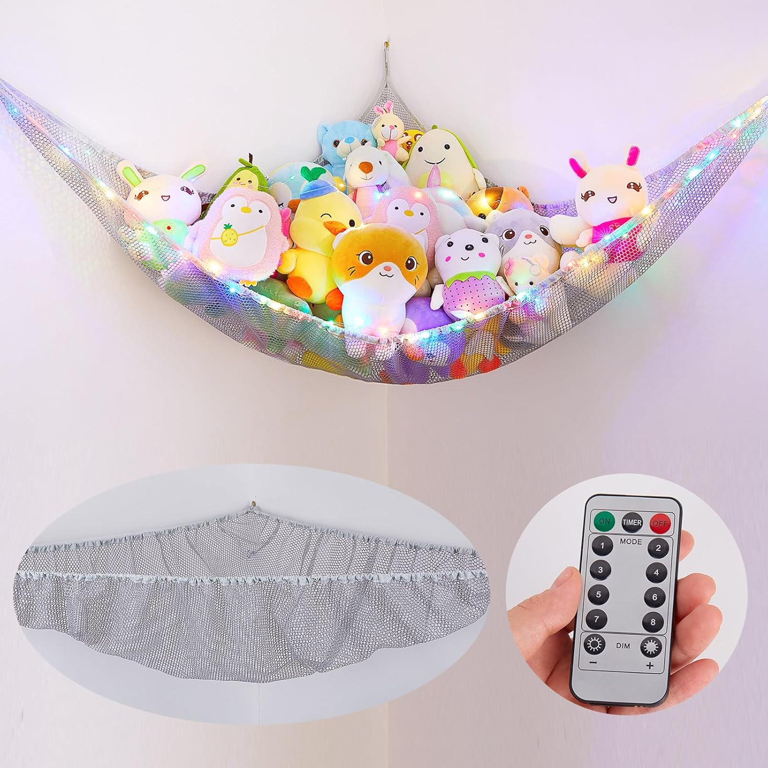 Basumee Stuffed Animals Net or Hammock with LED Light Hanging Toy Net Hammock for Stuffed Animals Storage Stuff Animals Hammocks for Nursery Room with Remote Control, 8 Kinds of Lights(Pack of 1)