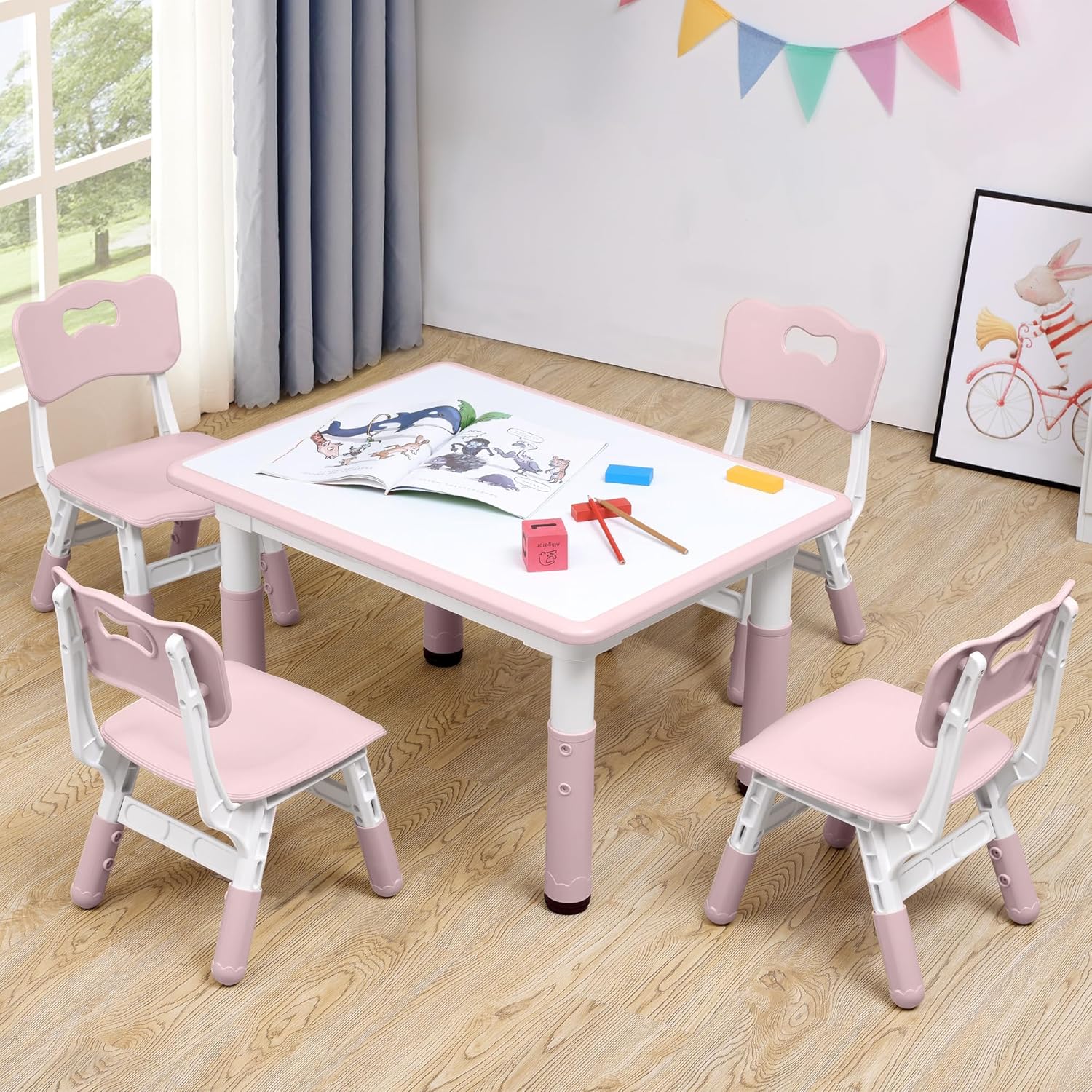 CuFun Kids Table & Chairs Set (2 Chairs) Height Adjustable for Ages 2-8 | Non-Slip Toddler Activity Table with Wipe-Clean Desktop, Montessori Learning & Art Drawing Tables for Home Preschool