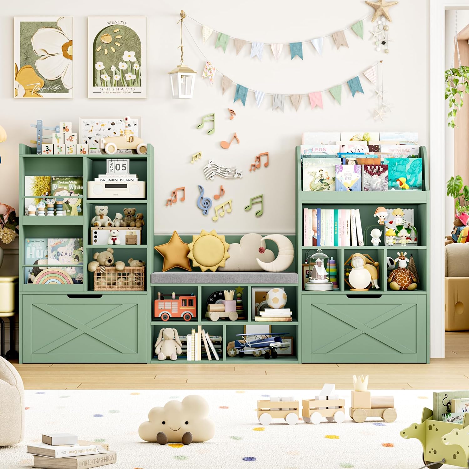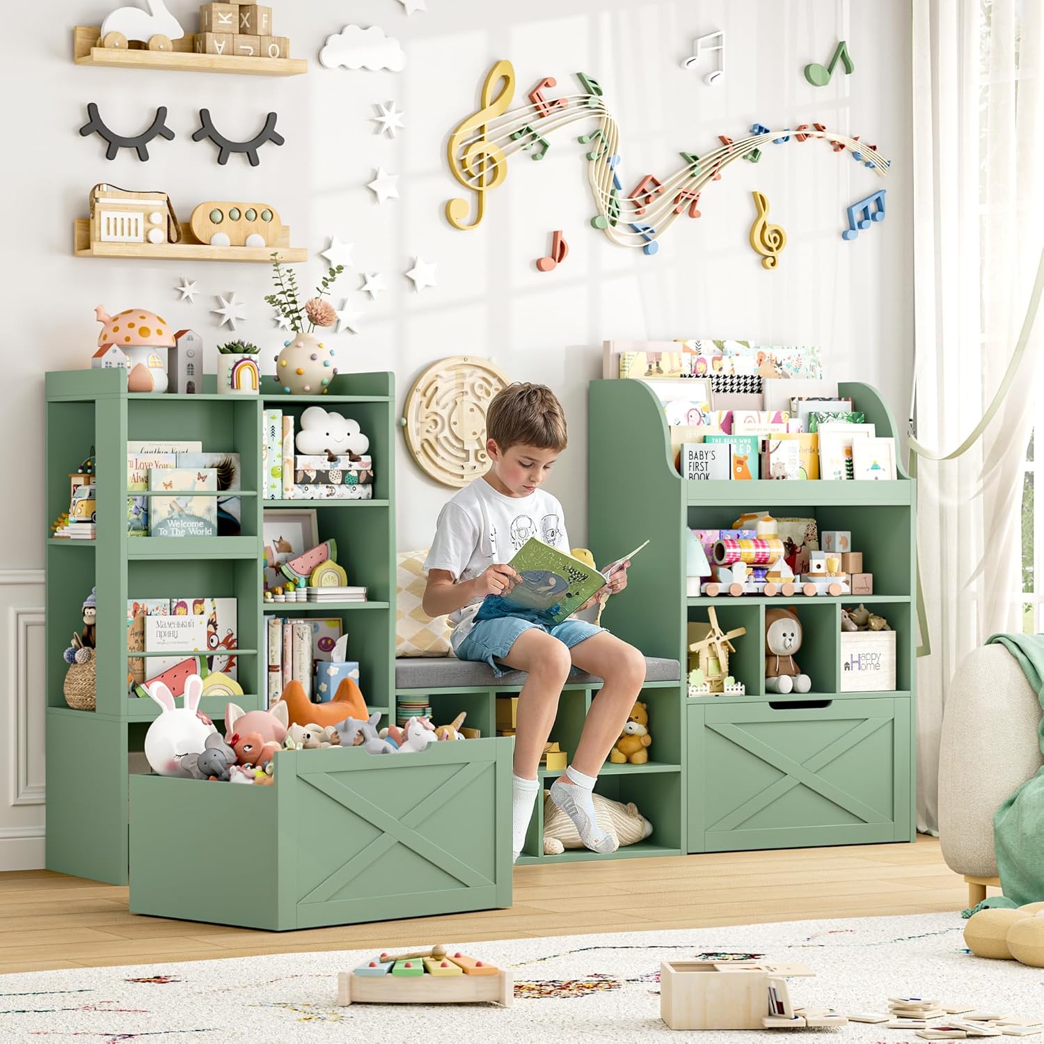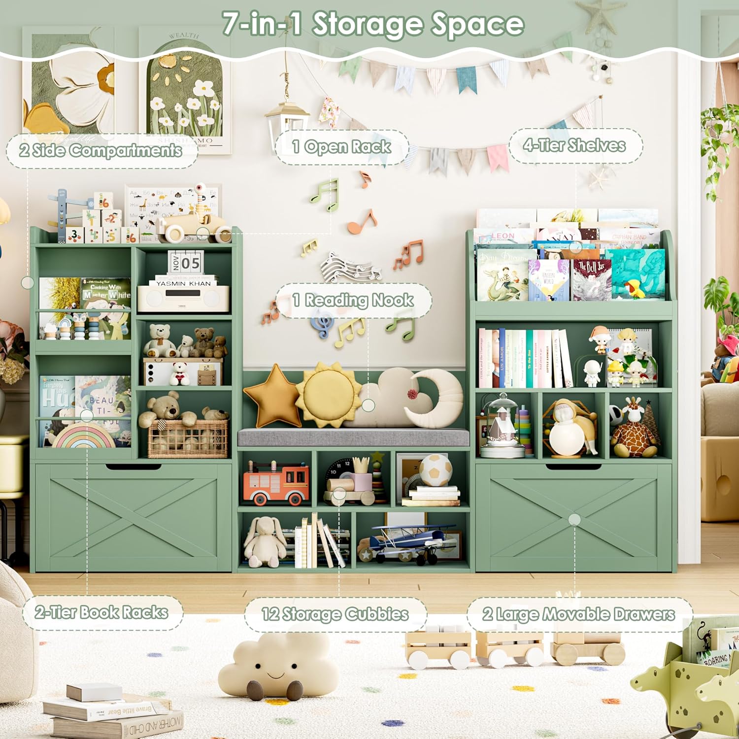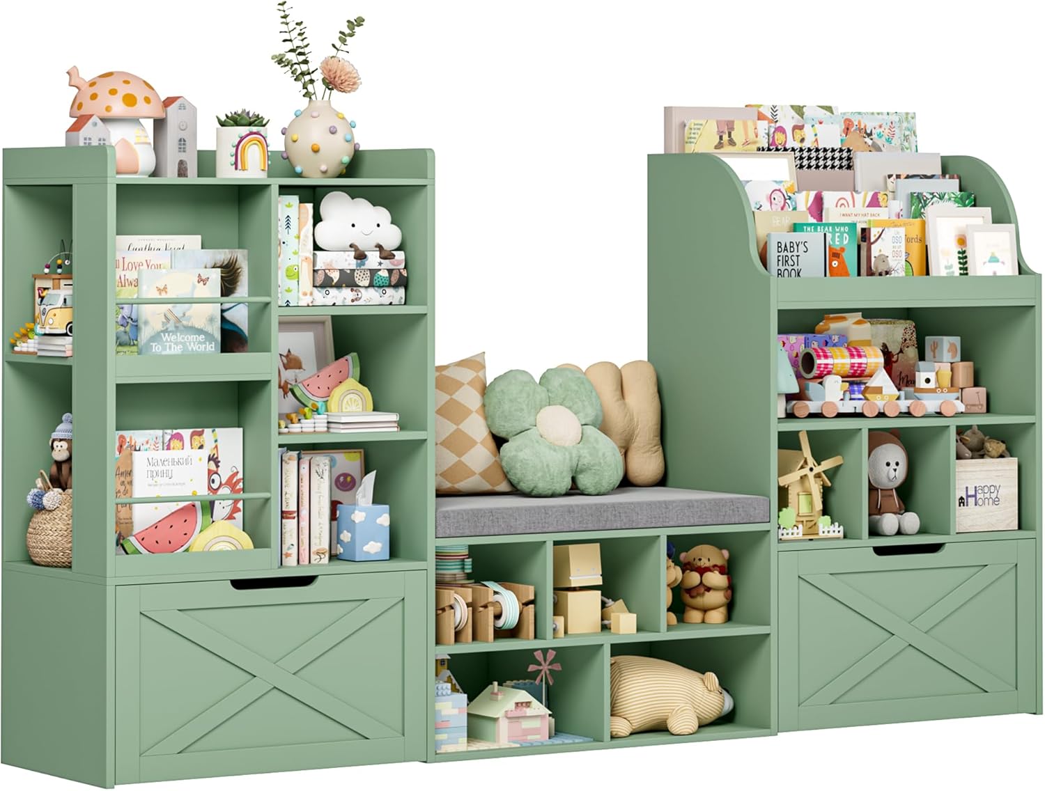 FINETONES 75u201D W Kids Bookshelf with Reading Nook, Large Toy Storage Toy Organizer with Seat Cushion and 2 Movable Drawers, Kids Reading Nook Kid Bench for Playroom Living Room, Green