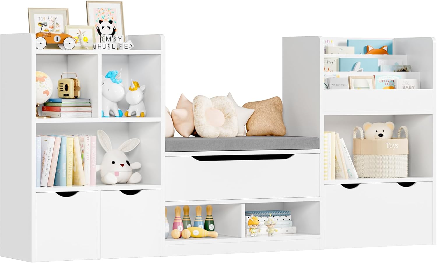 FOTOSOK 72u201D Kids Bookshelf with Reading Nook, Large Toy Storage Organizer with Seat Cushion and 3 Movable Drawers, Kids Reading Nook Toy Organizers and Storage with Bench for Living Room, White