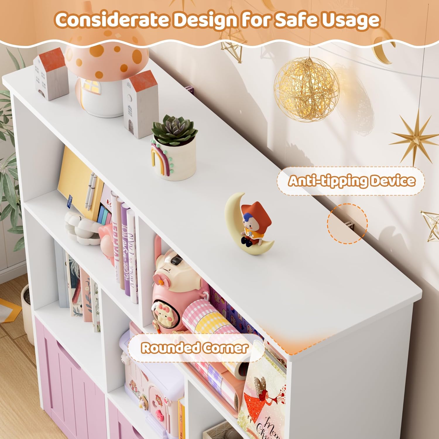 FOTOSOK Toy Storage Organizer with 3 Movable Drawers, Floor Storage Cabinet Toy Chest with Hidden Wheels and 5 Storage Cubbies, Multifunctional Storage Chest for Living Room, Home Office, Pink
