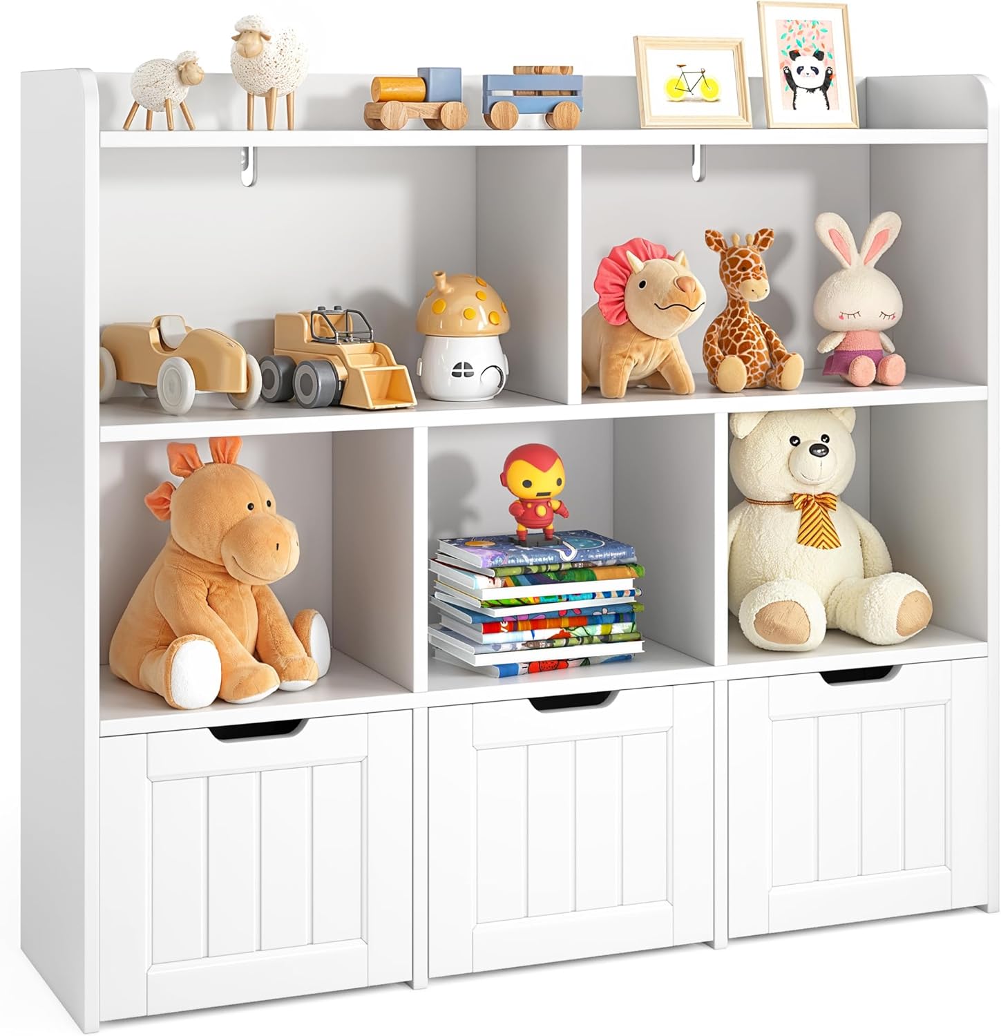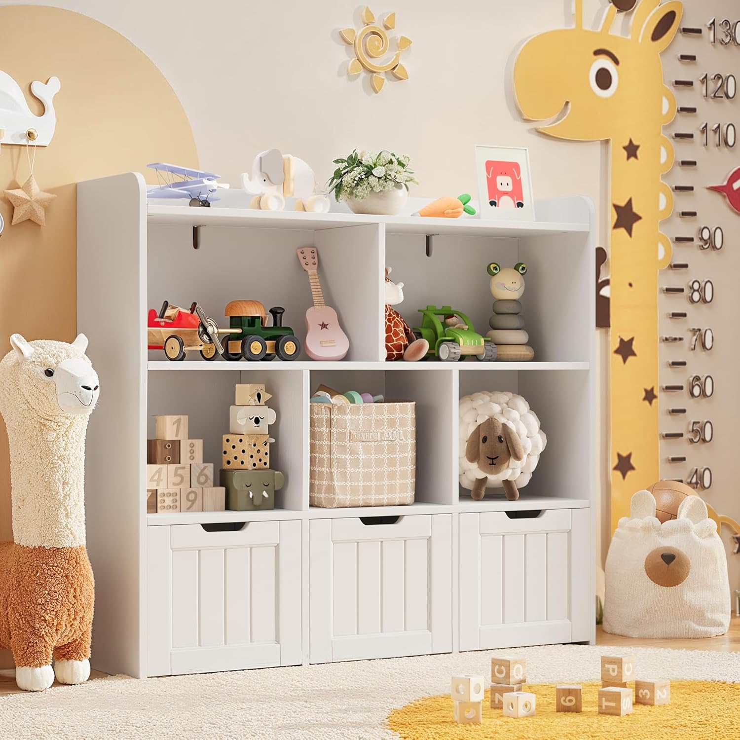 Gizoon Toy Storage Cabinet and Kids Bookcase with 3 Movable Drawers and 6 Open Shelves Featuring Fall Prevention Barrier for Playroom Nursery Kids Room Organization, White