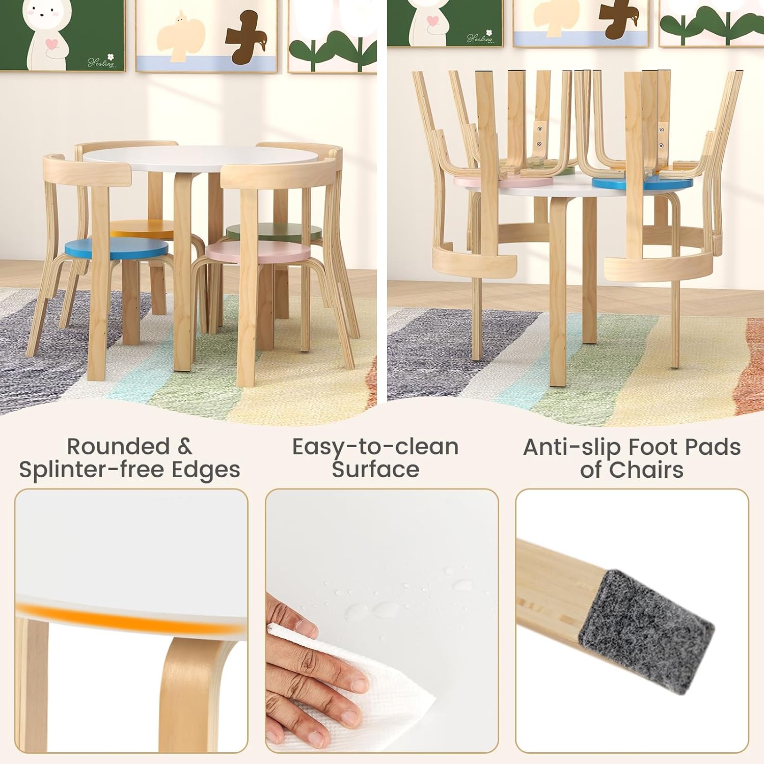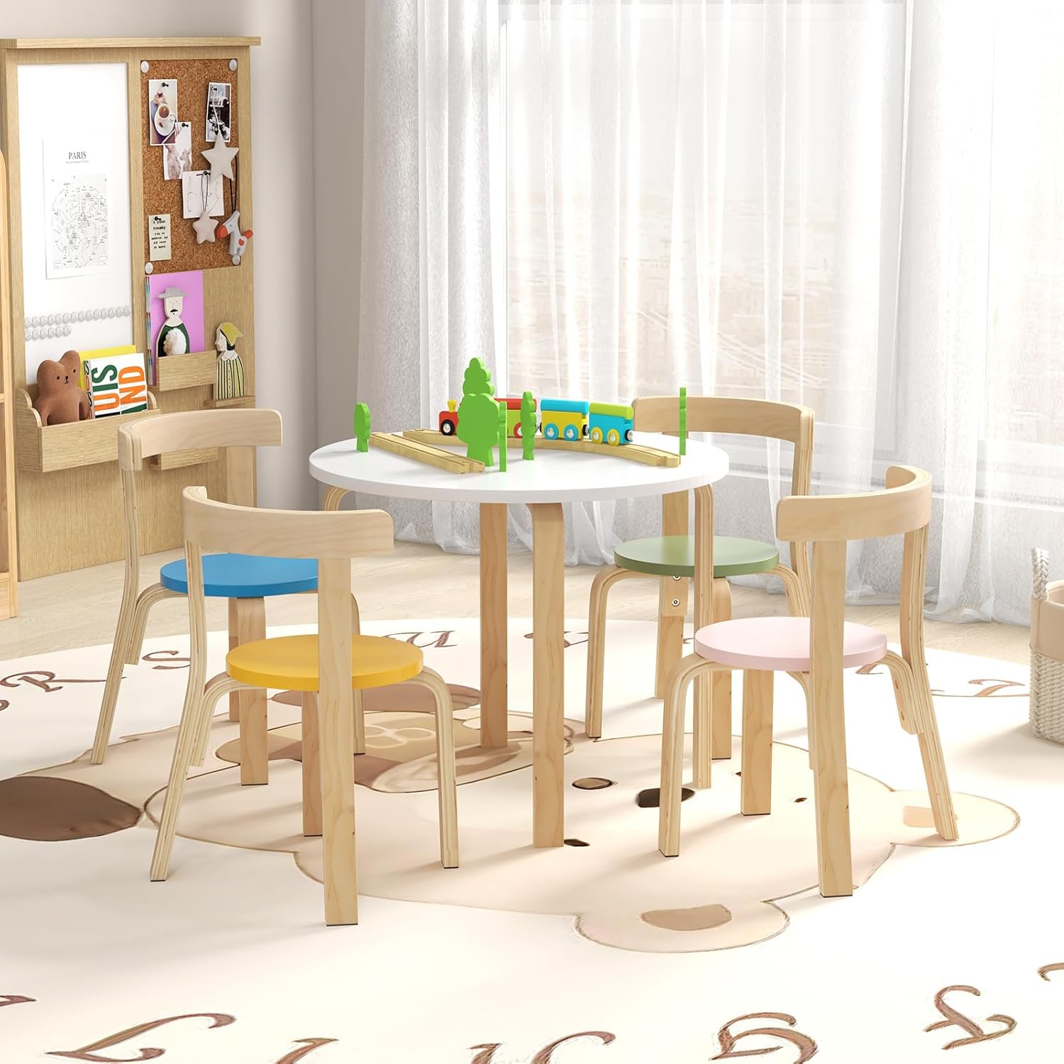 HONEY JOY Kids Table and Chair Set, Bentwood Toddler Round Table and 4 Chairs for Craft Art, Building Block, 5-Piece Children Furniture Set for Daycare, Kindergarten, Playroom (Colorful)
