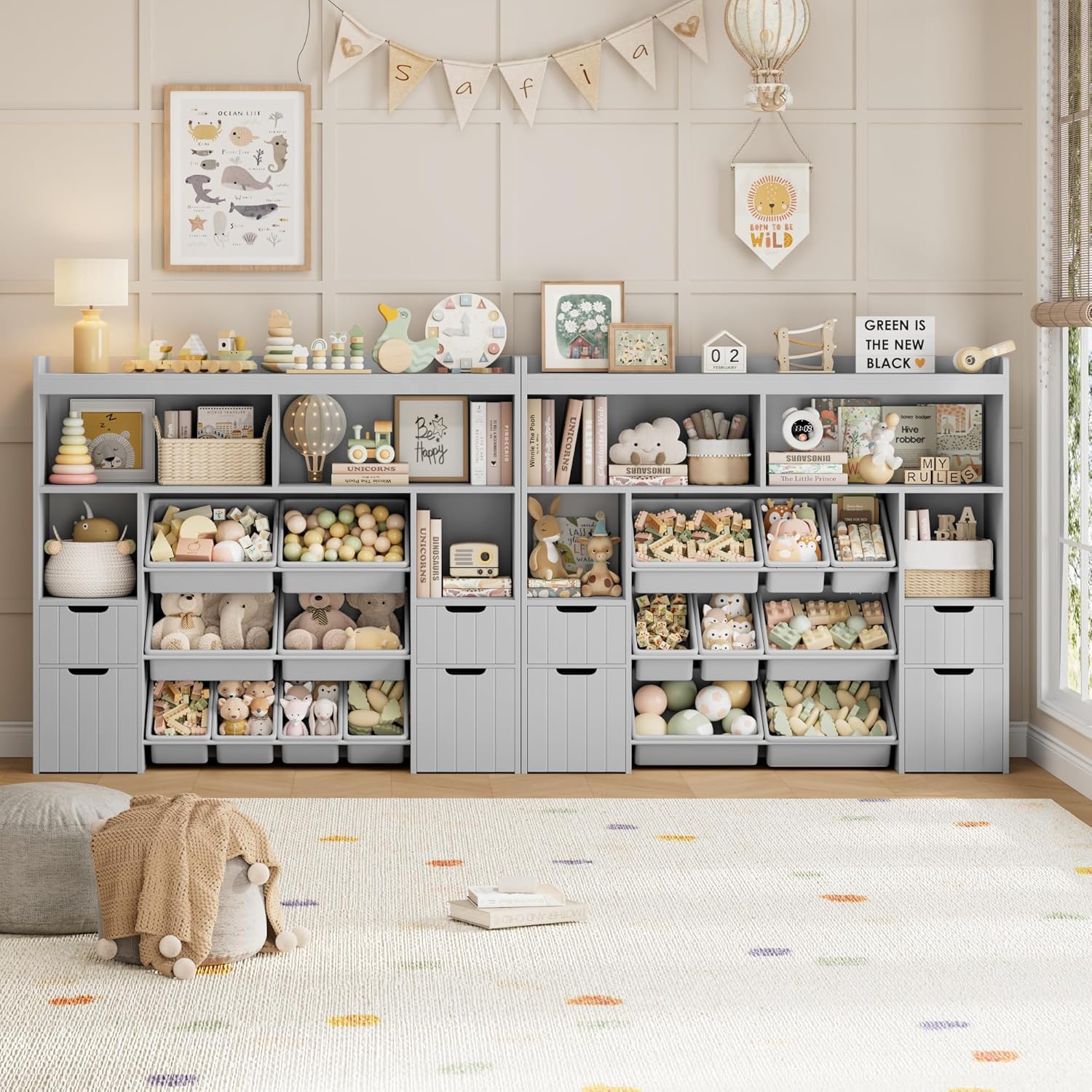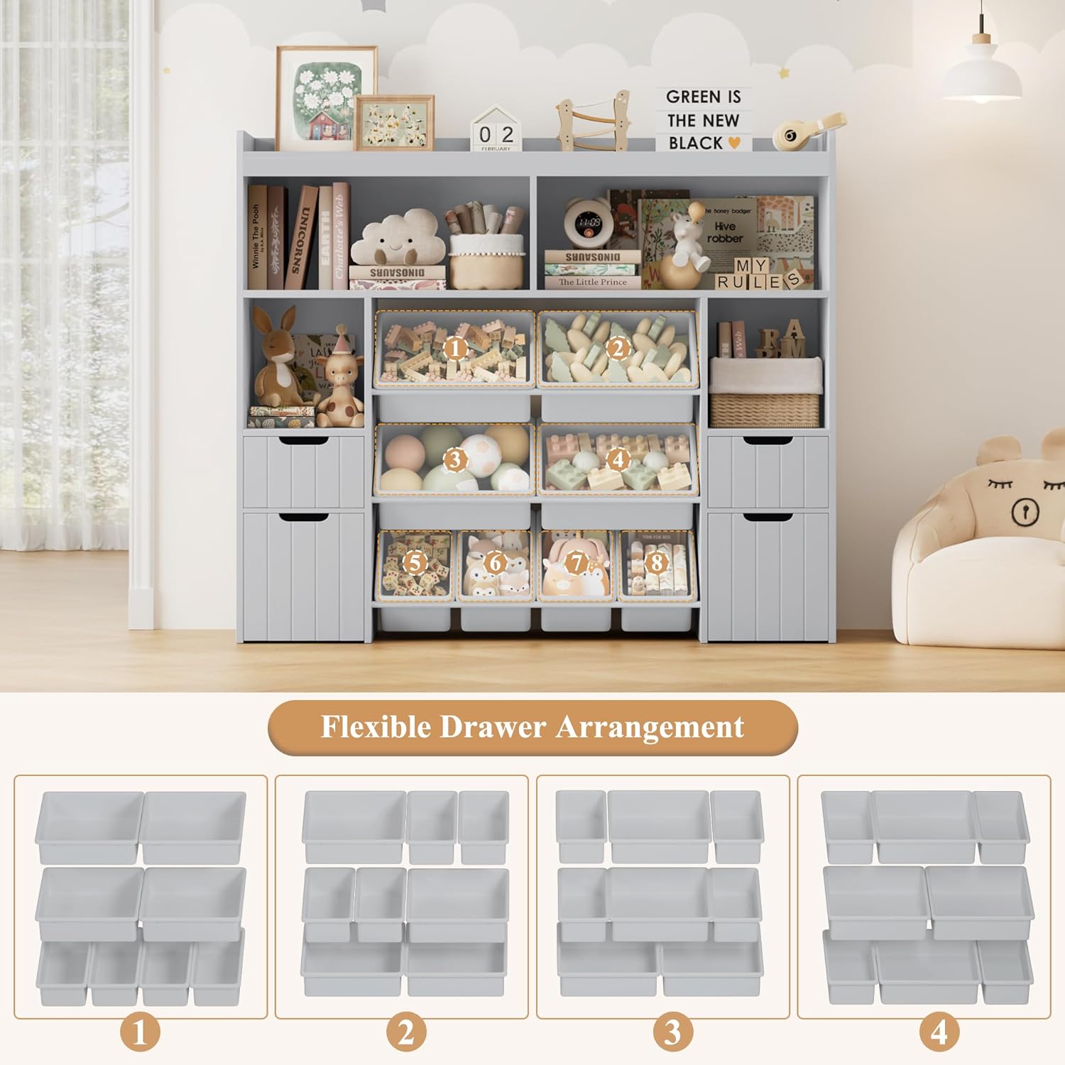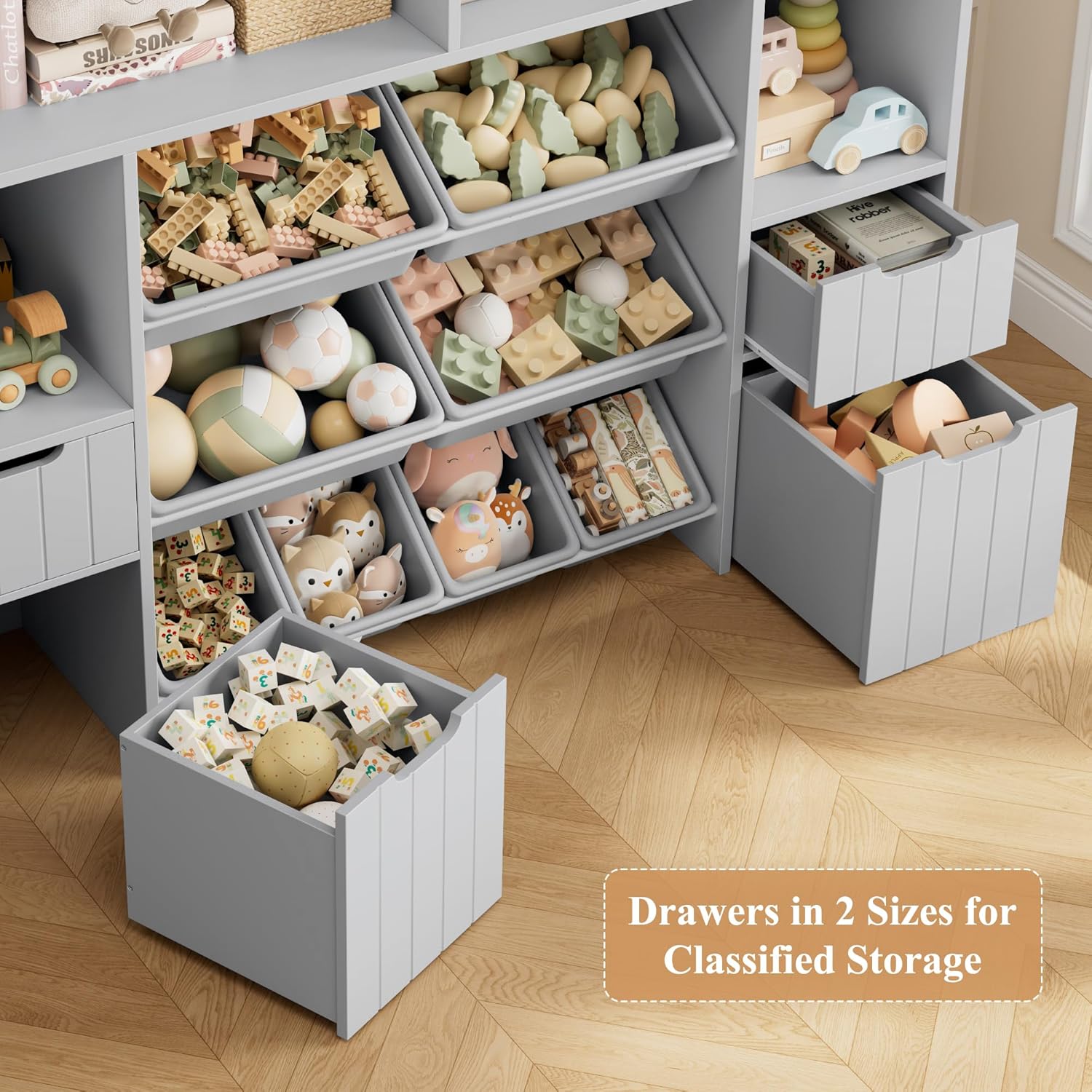 HORSTORS 55″ W Toy Storage Organizer with Drawers, Large Kids Toy Storage Box with Removable Bins, Tall Kids Bookshelf and Bookcase for Boys and Girls, Modern Toy Chest for Playroom, Classroom, Grey