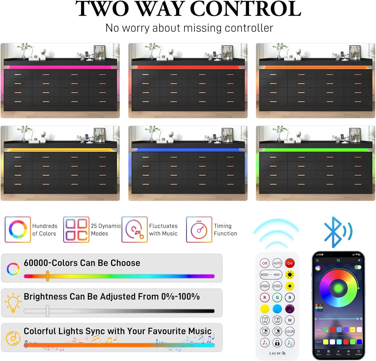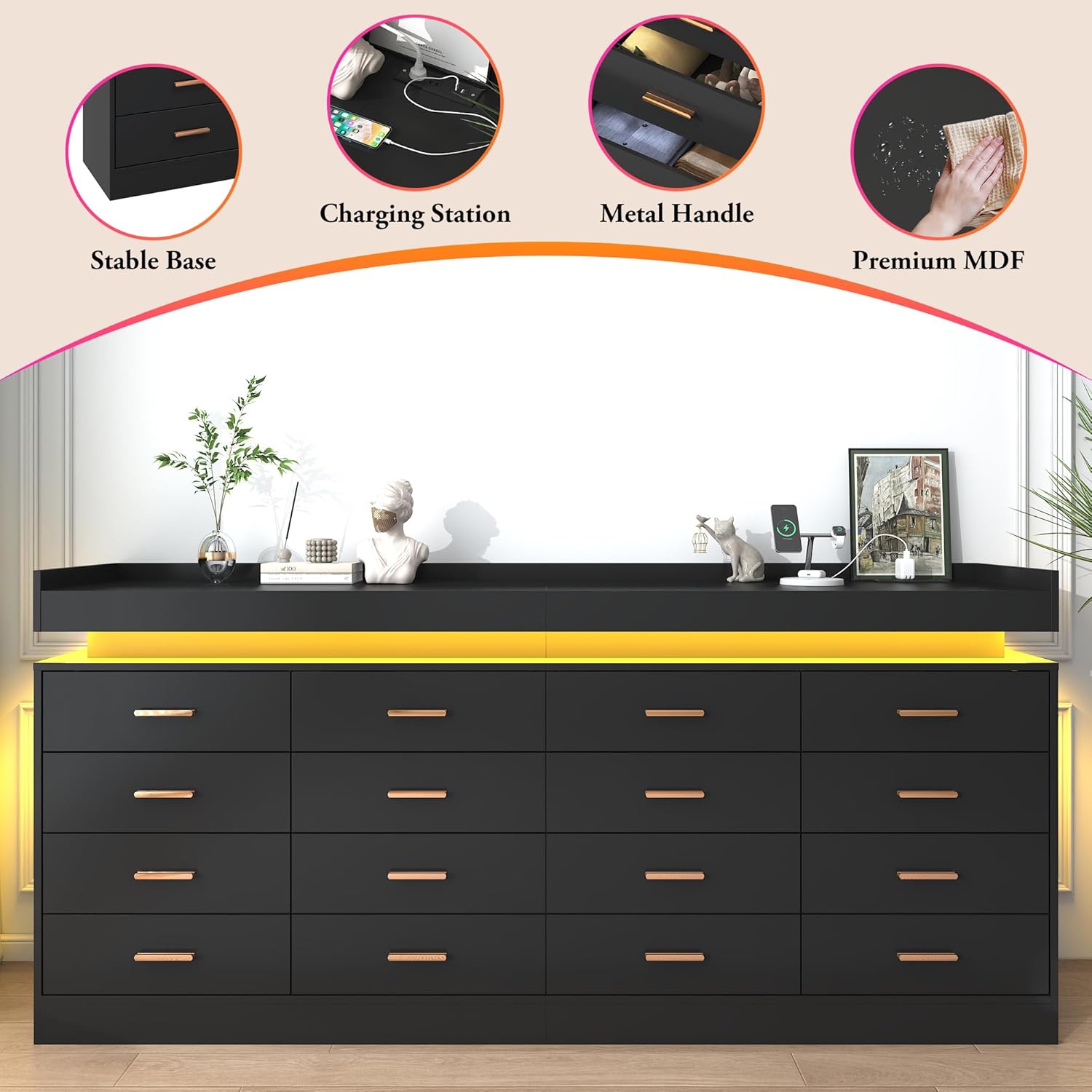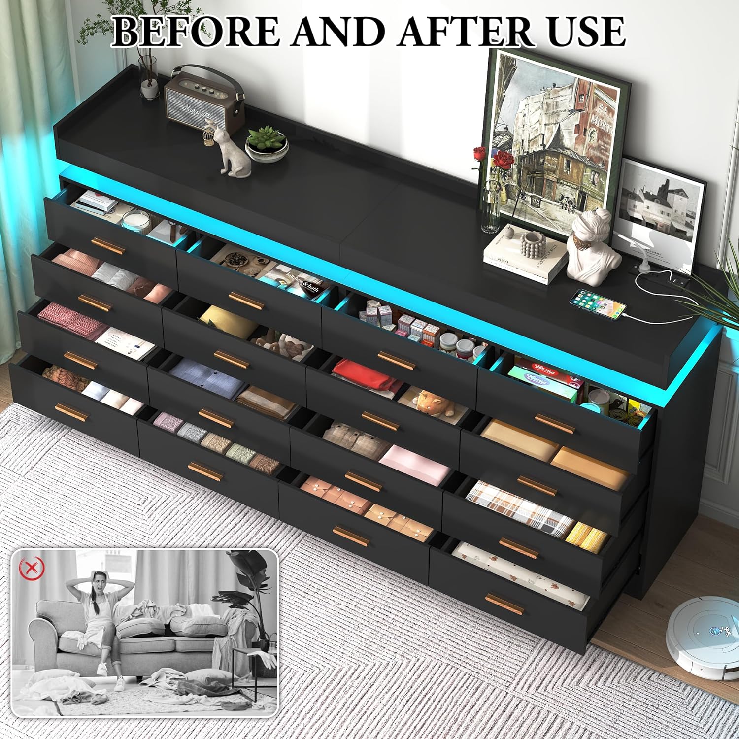 jiteentarou 16 Drawer Dresser with Charging Station and LED Lights, Modern Chest of Drawers with Power Outlet, Organizer Cabinet for Bedroom, Living Room, Entryway, Black