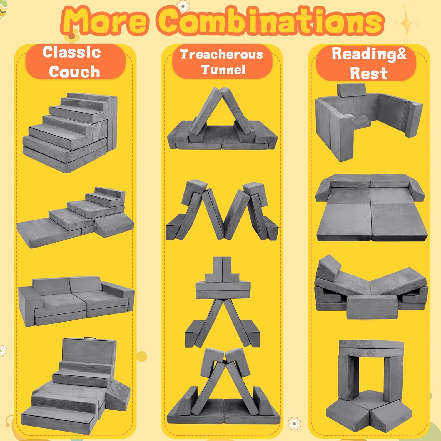 MeMoreCool Kids Modular Play Couch u2013 8-Piece Glow-in-The-Dark Dinosaur Sofa for Toddlers Convertible Fort Builder | Washable Covers | Creative Playroom Furniture for Boys & Girls