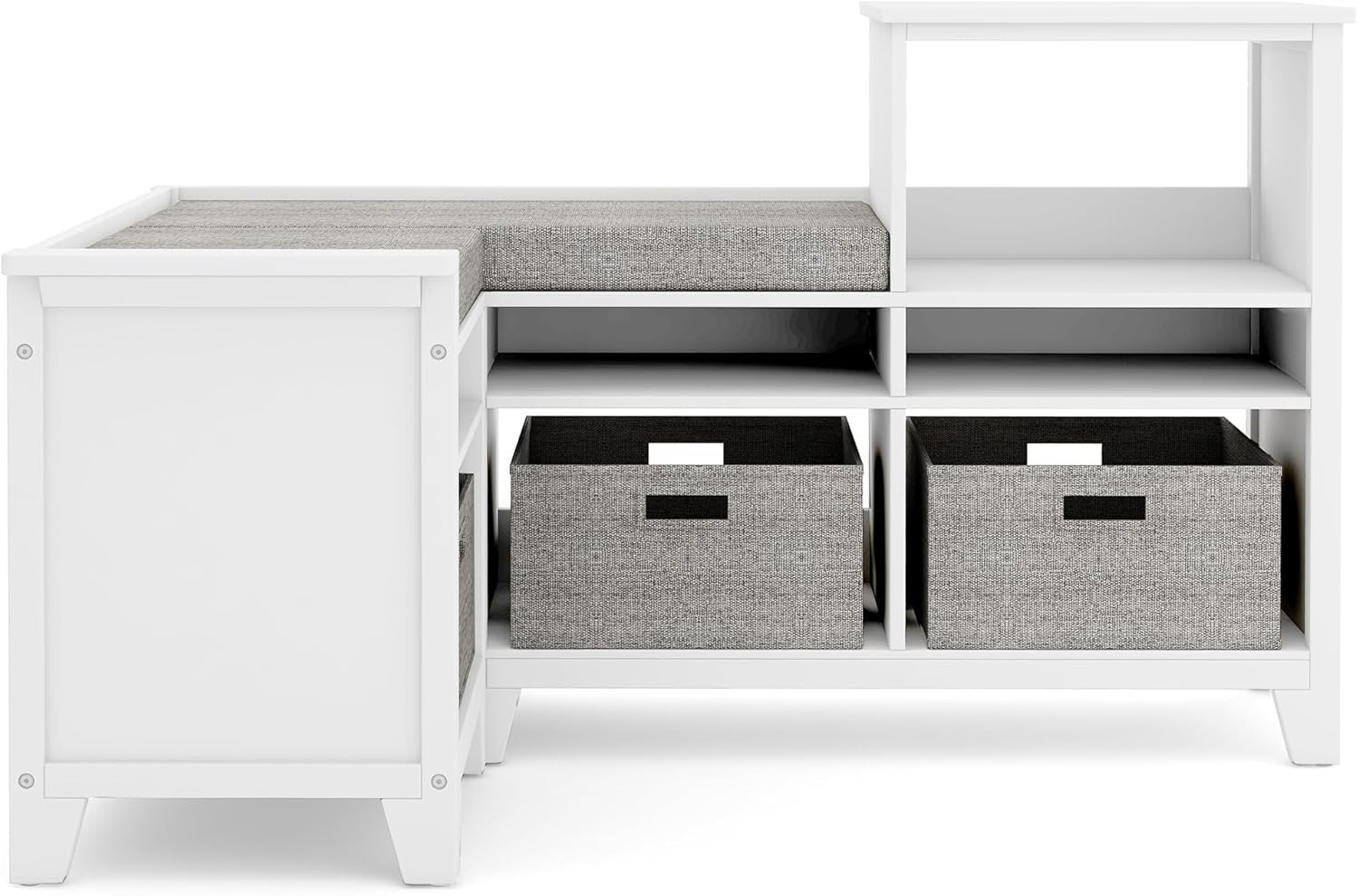 Martha Stewart Kids’ Corner Nook – Linen White: Wooden Storage Bench Bookcase Organizer with Seat Cushion and Fabric Bins for Reading in Bedroom or Playroom