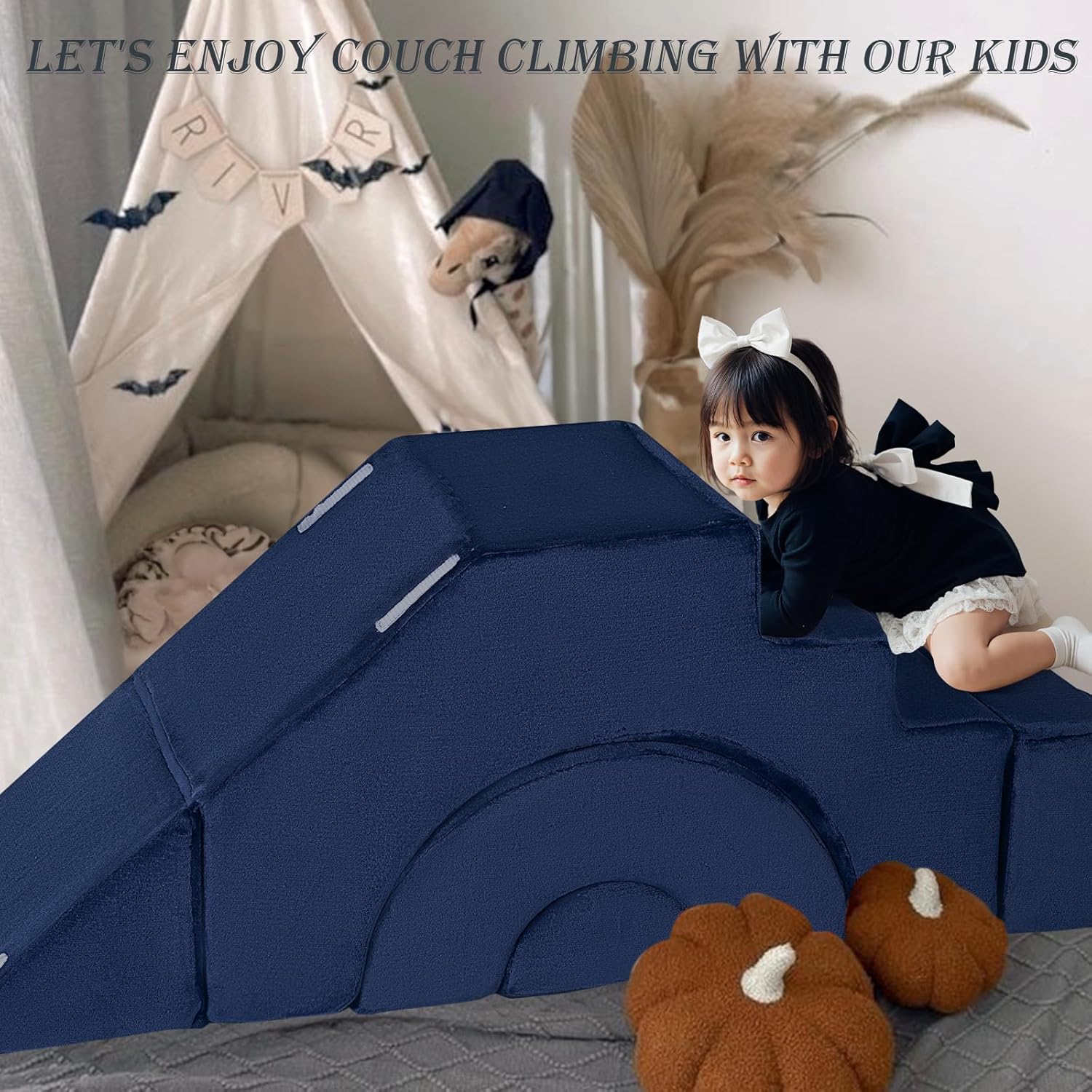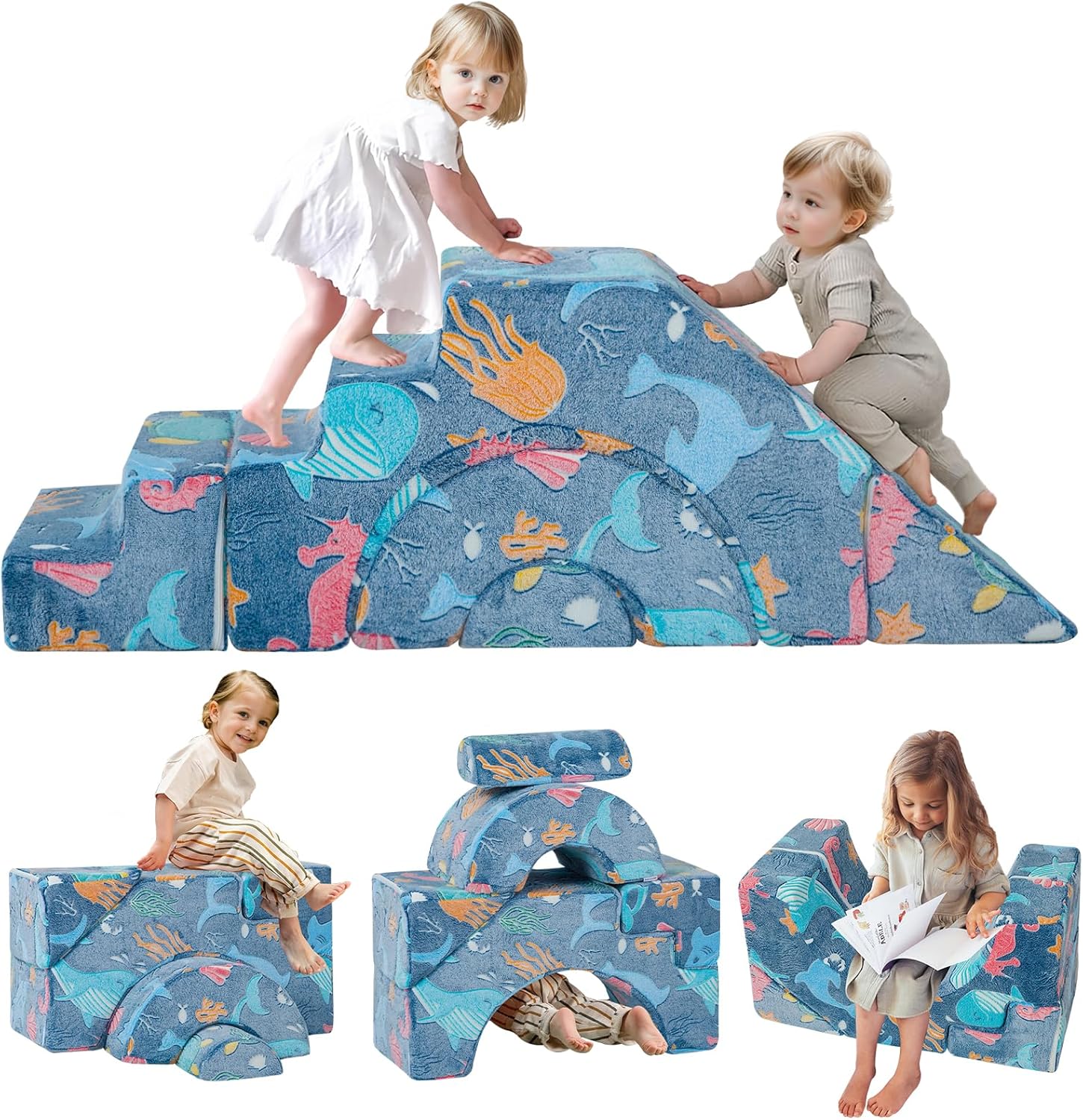 MeMoreCool Modular Kids Sofa, Foam Couch Sofa with Slide & Stair Design, Convertible Kids Couch for Playroom, Sectional Child Furniture for Bedroom Living Room, Navy