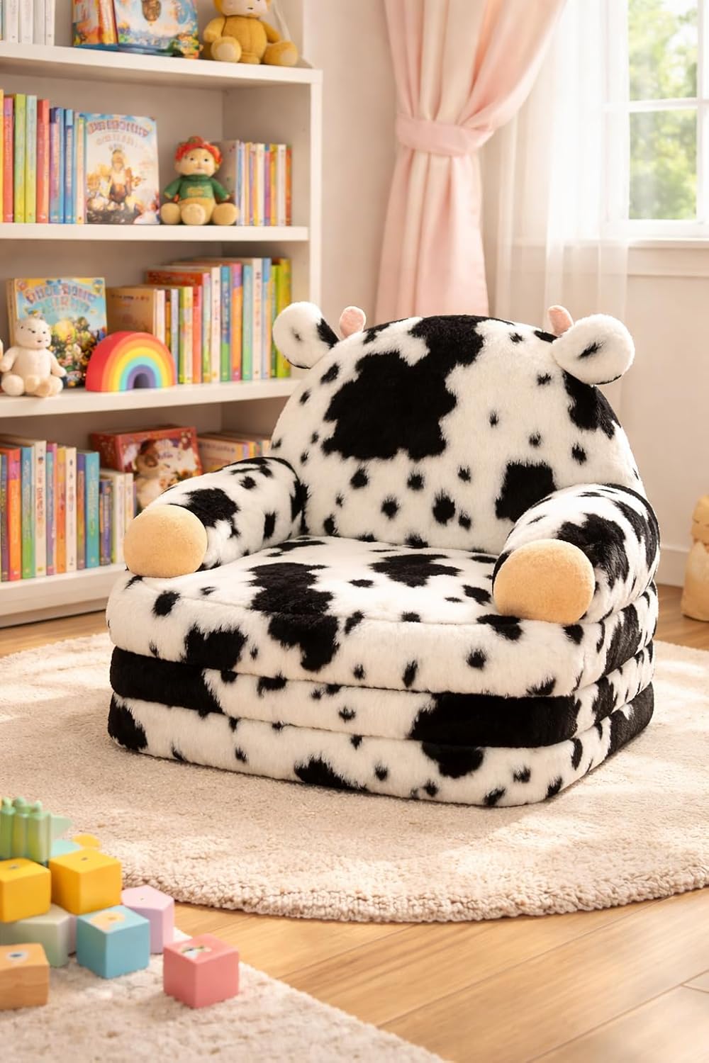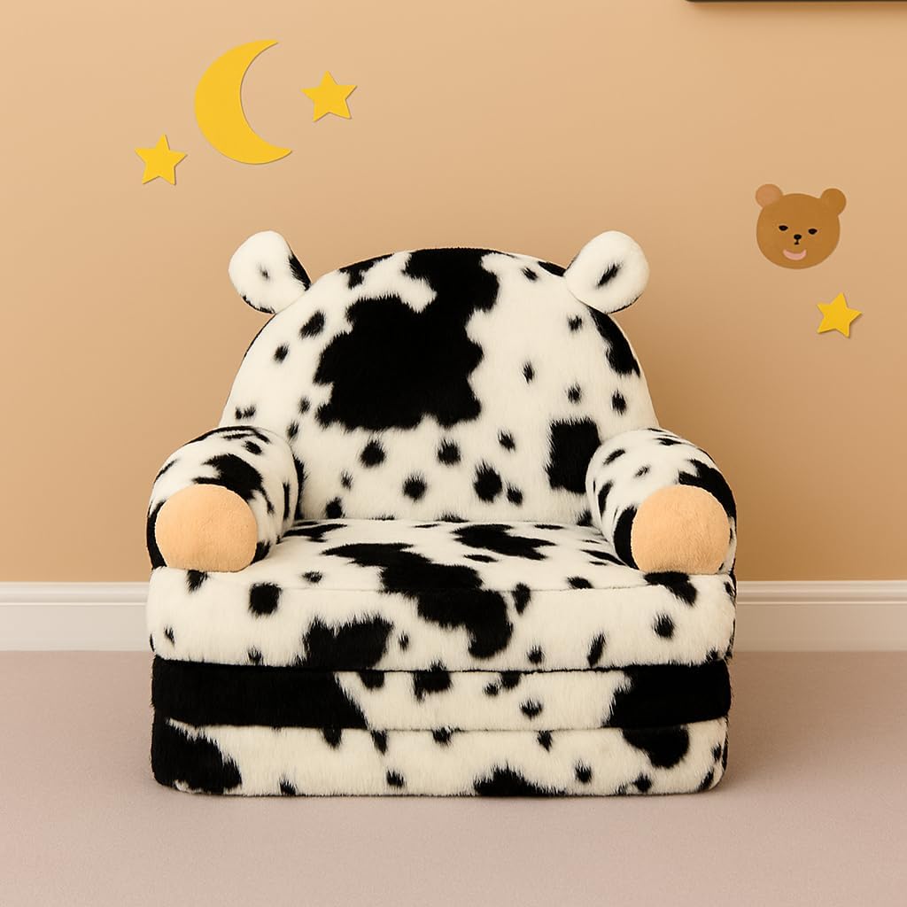 QIUODO Toddler Chair with Faux Rabbit Fur u2013 2-in-1 Foldable Kids Couch, Soft Sofa for Reading, Bedroom or Playroom Use, Ages 1-3(Cow)