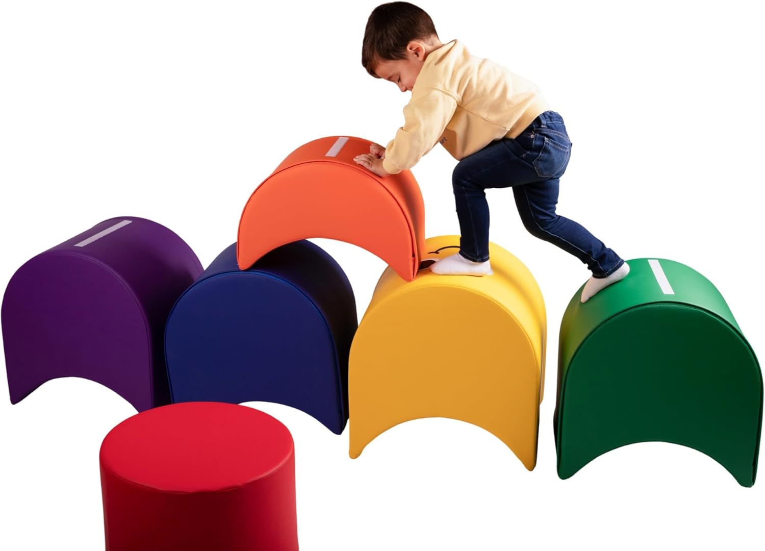 This vibrant and oversized caterpillar bench is made up of six foam modules, each covered in easy-to-clean synthetic leather. The colorful segments can be quickly assembled, taken apart, or rearranged into different shapes. Children can lie across the bench or sit on individual modules to relax, play, or engage with peers. This soft seating area promotes visual-motor coordination, social interaction, and the development of gross motor skills.