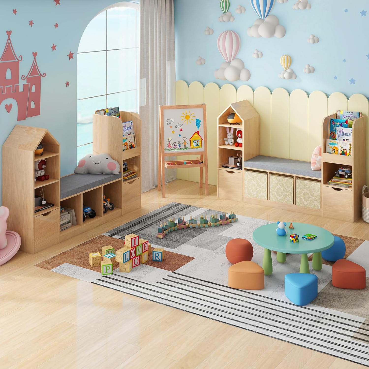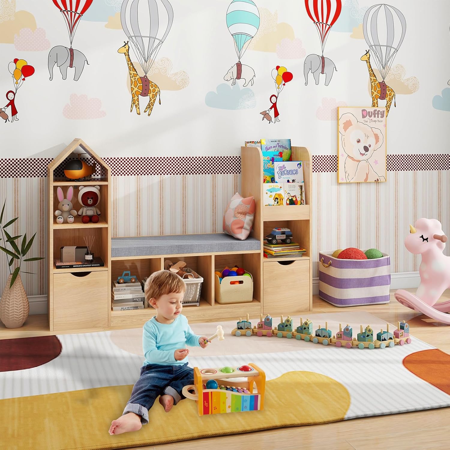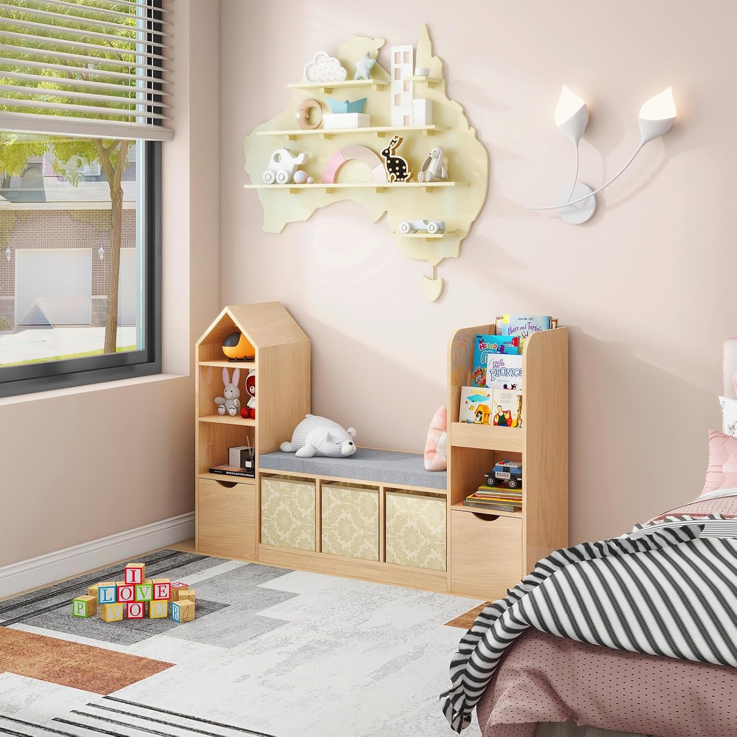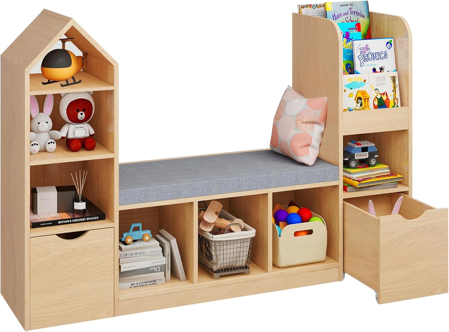 Vabches Toy Storage Organizer for Kids Bookshelf with Reading Nook, Multifunctional Kids Bookcase with 7 Storage Cubbies, 2 Movable Drawers and Seat Cushion for Keeping Kids’ Toys Books Organized, Oak
