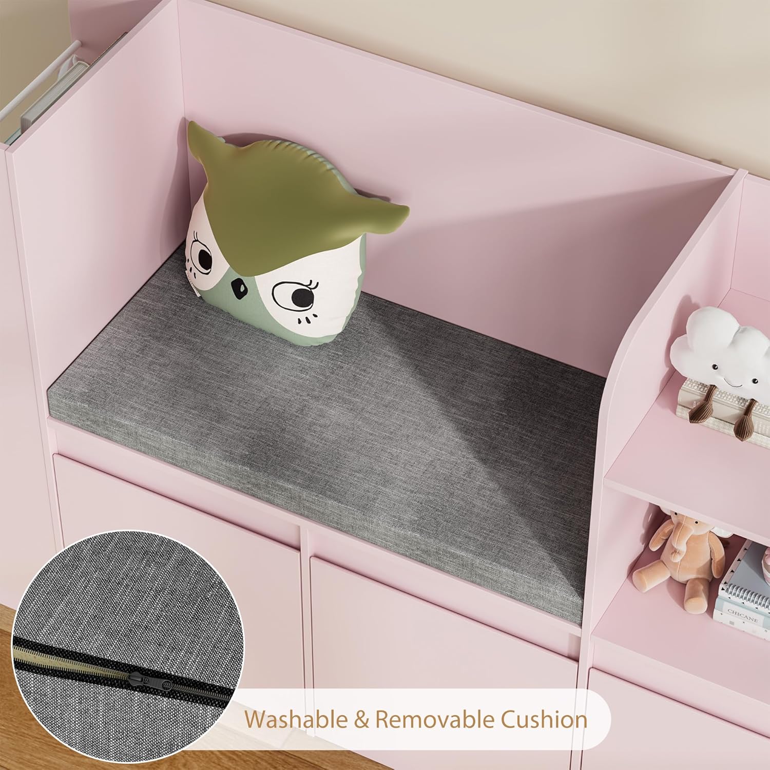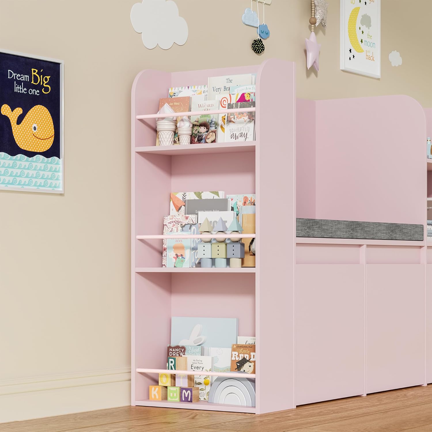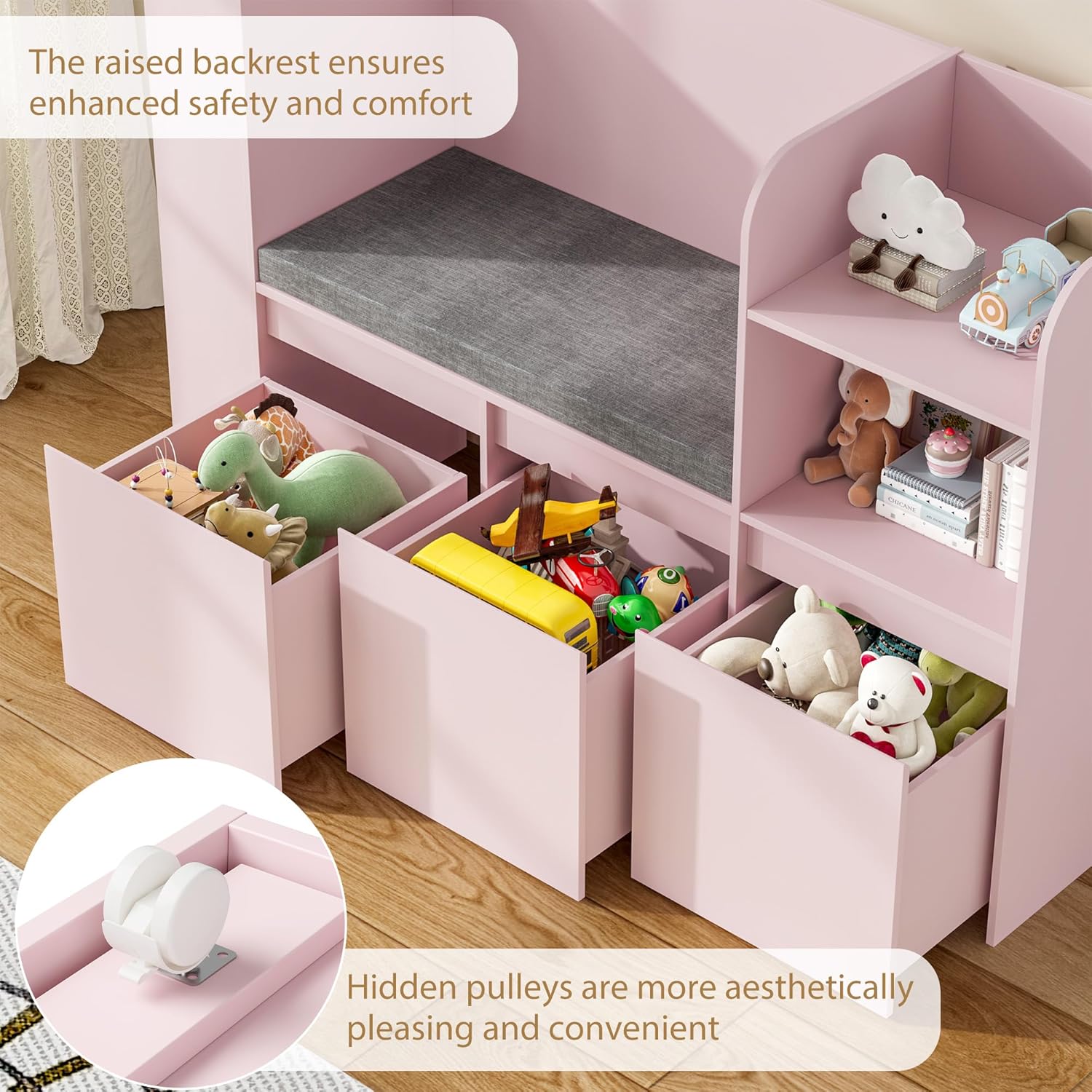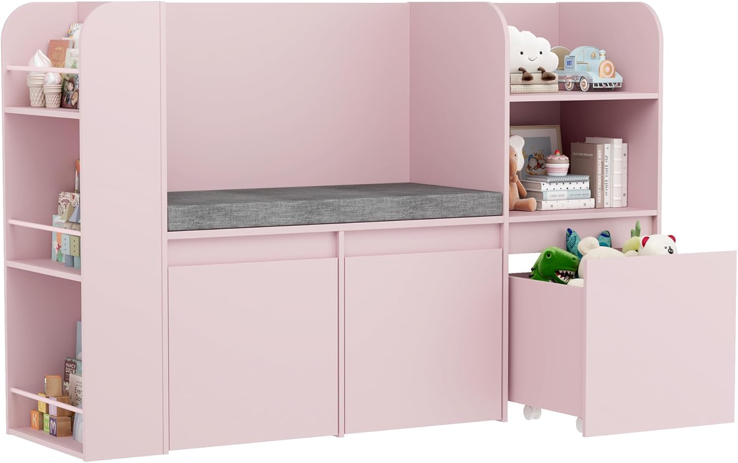 VortinT Kids Reading Nook with Bookshelf and 3 Movable Drawers, Kids Bookshelf with Toy Storage Organizer, Children Bookcase with Seat Cushion for Girl Gift, Playroom, Bedroom, School, Pink